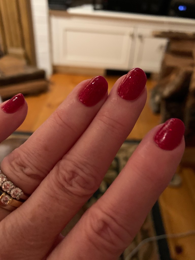 Let’s discuss the nails. I got the greatest sparkly red, like ten little parties on my nails. Its amazing how something so simple can make you feel great, like everything can’t be that desperate if your nails look this good. I know its crazy, but there you are. Tell me they aren’t gorgeous.