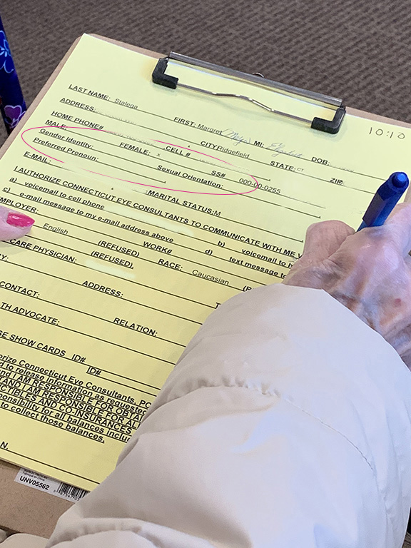 Yesterday I took her to see the eye doctor. First up was filling out the forms, which through her for a loop, see below: